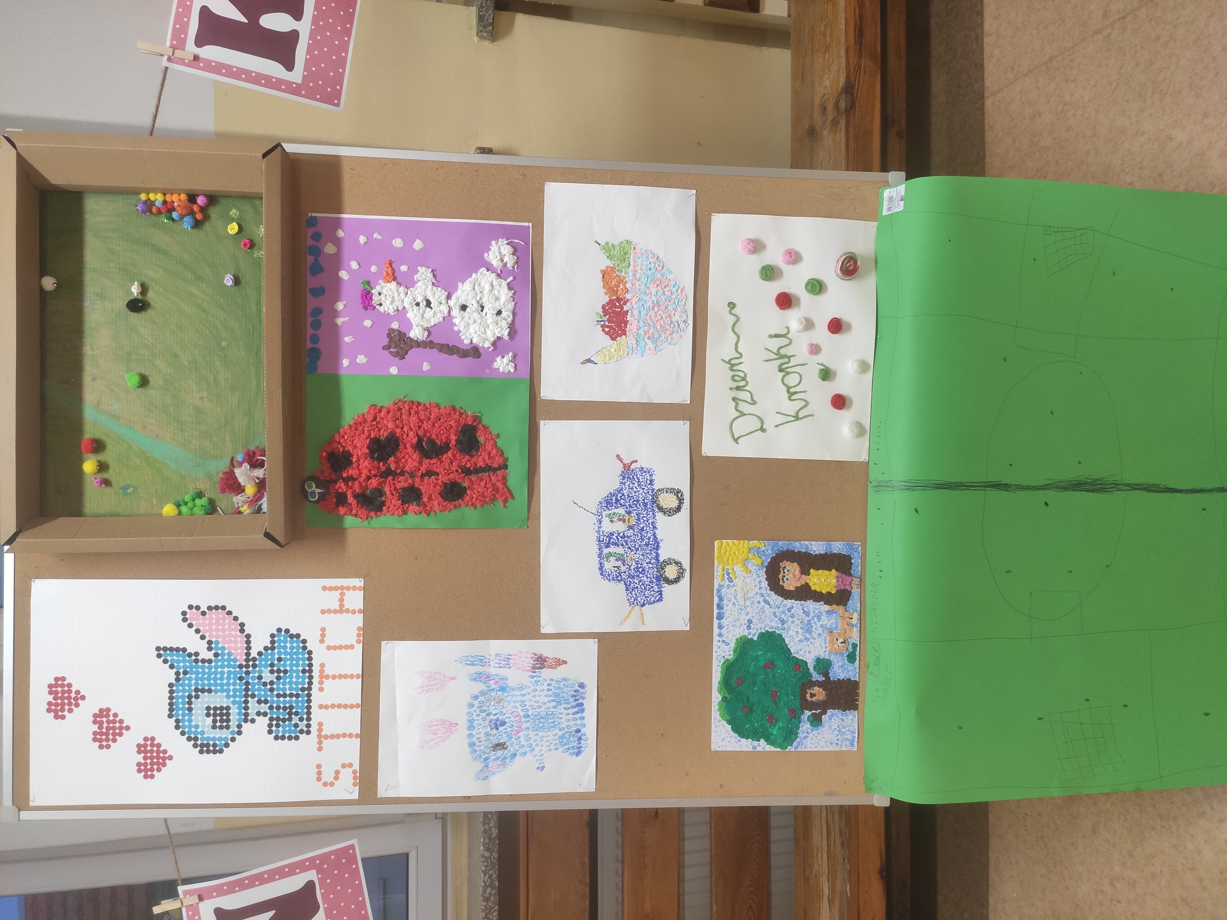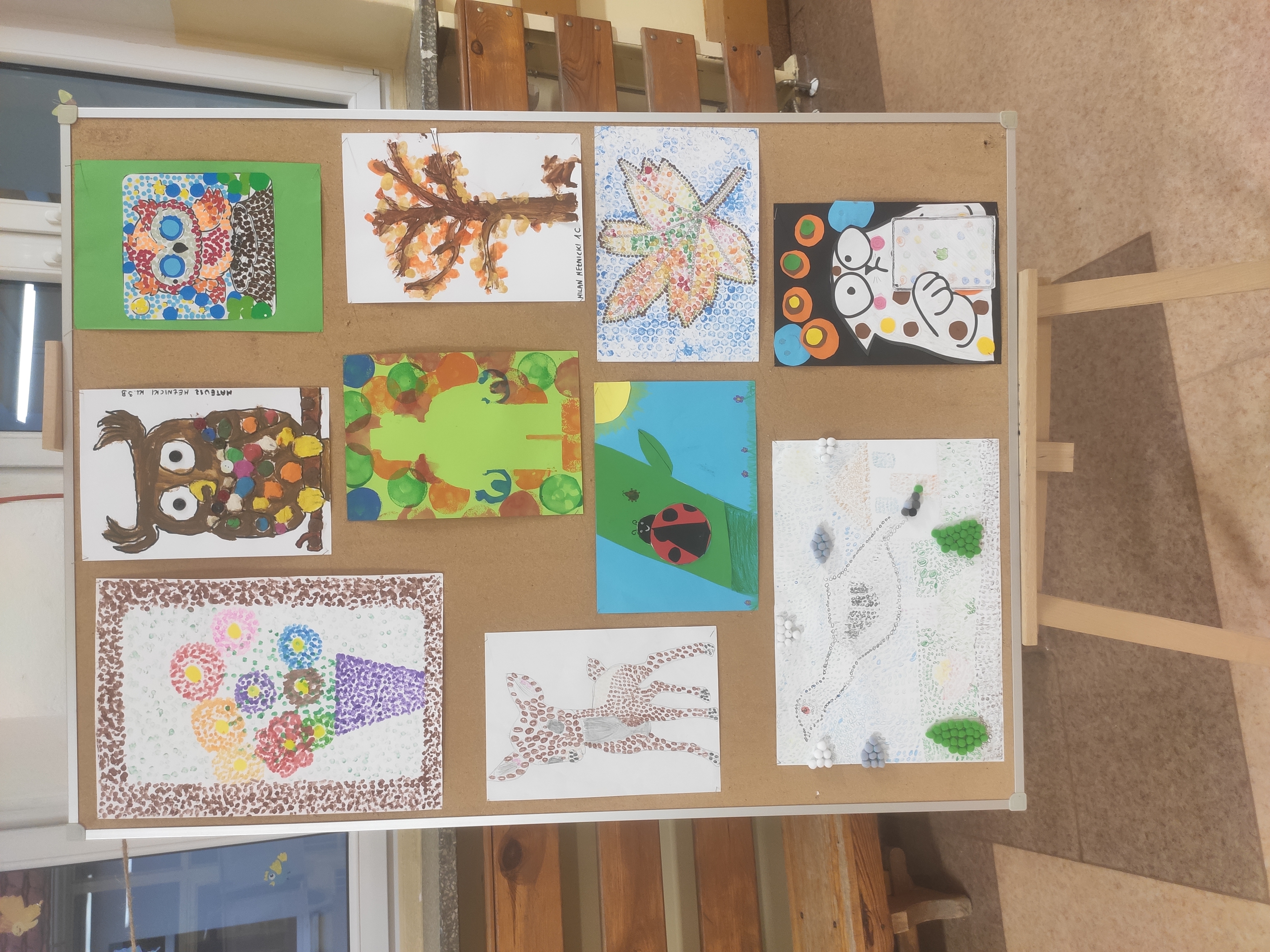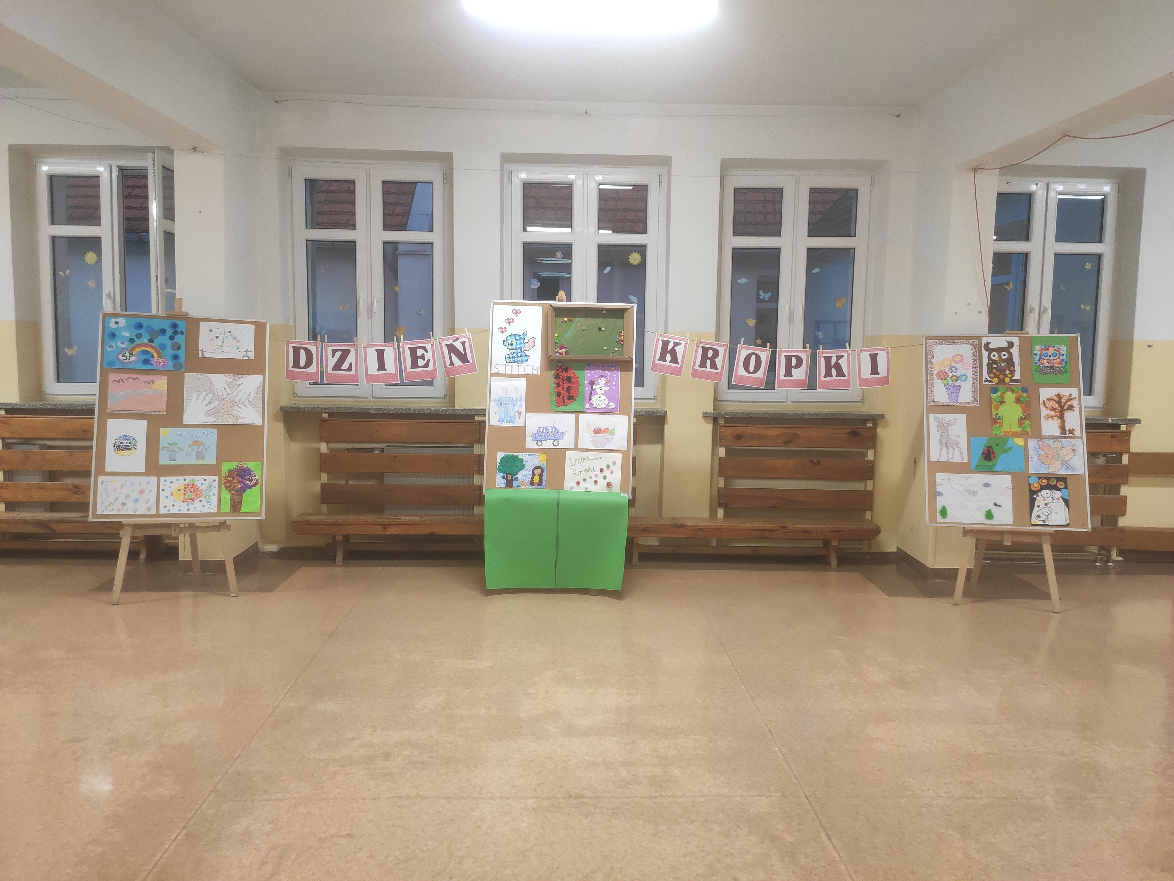 Dzieci z ogromnym entuzjazmem podjęły wyzwanie, tworząc kolorowe obrazy, kolaże i kompozycje, które zachwyciły różnorodnością i oryginalnością. W pracach pojawiły się zarówno abstrakcyjne wzory, jak i przedstawienia zwierząt, roślin czy fantastycznych światów – wszystko zbudowane wokół jednego małego, ale jakże inspirującego elementu: kropki.