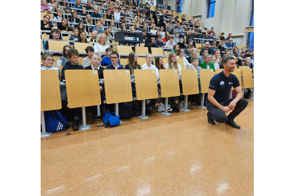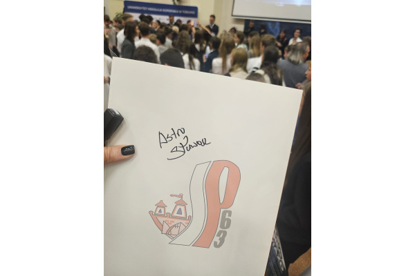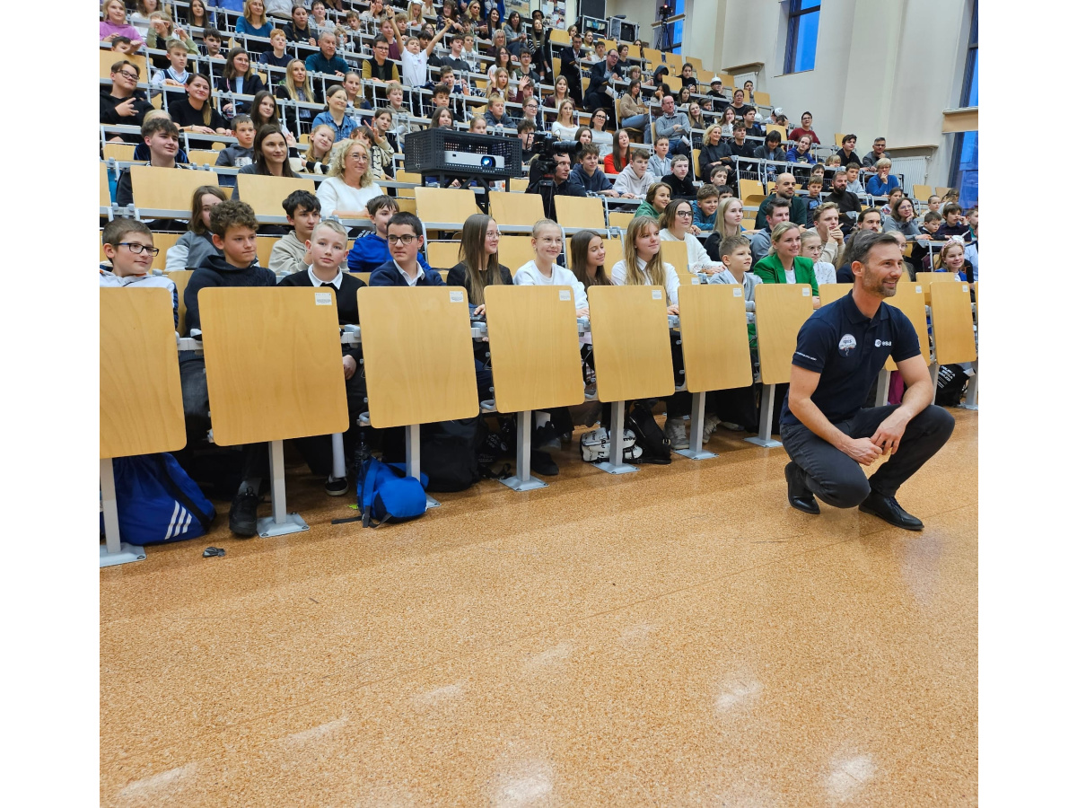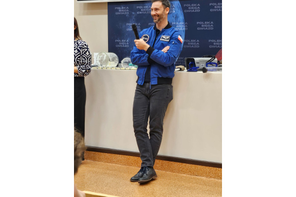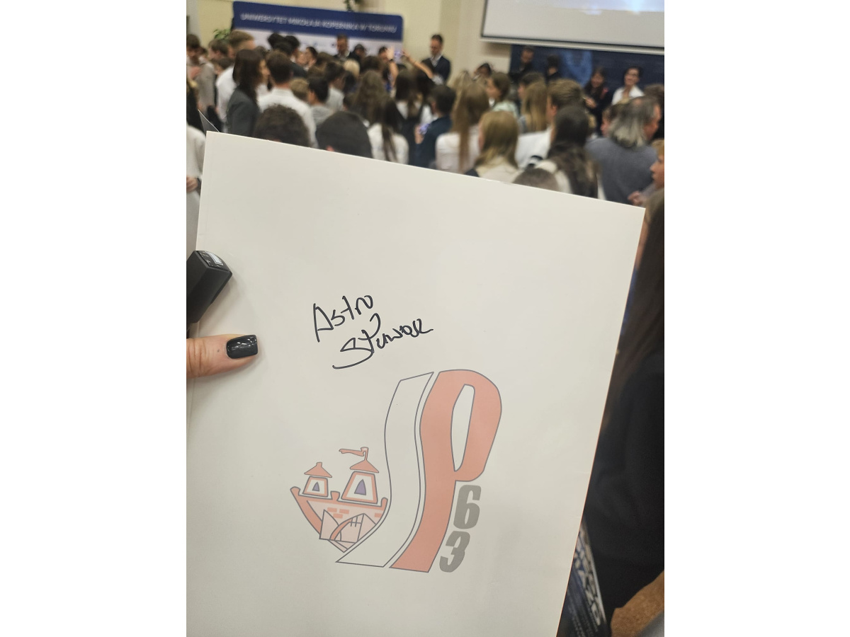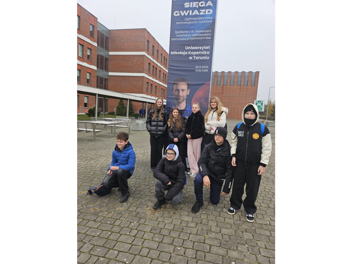 Spotkanie z astronautą – nasza szkoła sięga gwiazd! W czwartek, 20 listopada, grupa uczniów z naszej szkoły – Pola, Nadia, Hania, Zosia i Wiktor z klasy 6d oraz Wojtek, Szymon i Jeremiasz z klasy 6e – miała niezwykłą okazję uczestniczyć w spotkaniu z polskim astronautą, Sławoszem Uznańskim-Wiśniewskim. Wydarzenie odbyło się na Uniwersytecie Mikołaja Kopernika w Toruniu w ramach trasy naukowo-technologicznej „Polska sięga gwiazd”. To był dzień pełen inspirujących rozmów, naukowych atrakcji i prawdziwie kosmicznych emocji. Uczniowie mieli możliwość zadawania pytań, poznania tajników życia w przestrzeni kosmicznej oraz bezpośredniego kontaktu z drugim w historii Polakiem, który poleci w kosmos. Serdecznie dziękujemy Rodzicom za wsparcie i pomoc w organizacji wyjazdu oraz naszym uczniom za aktywność, ciekawość i piękne reprezentowanie szkoły. To spotkanie na długo pozostanie w naszej pamięci – jako dowód na to, że nauka może być fascynującą przygodą, a marzenia naprawdę sięgają gwiazd!