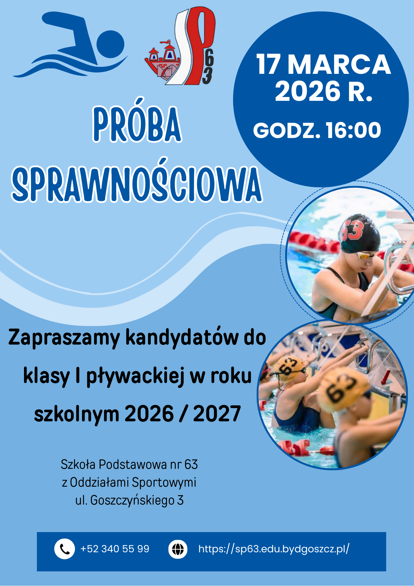 17 marca 2026 r. o godz. 16:00 odbędzie się próba sprawnościowa dla dzieci, które chciałyby rozpocząć naukę w klasie I pływackiej.