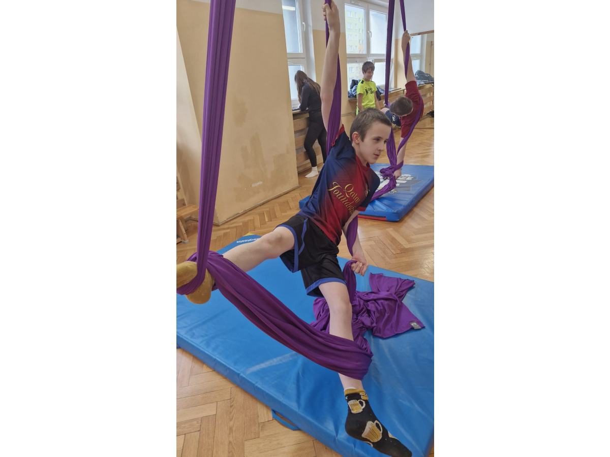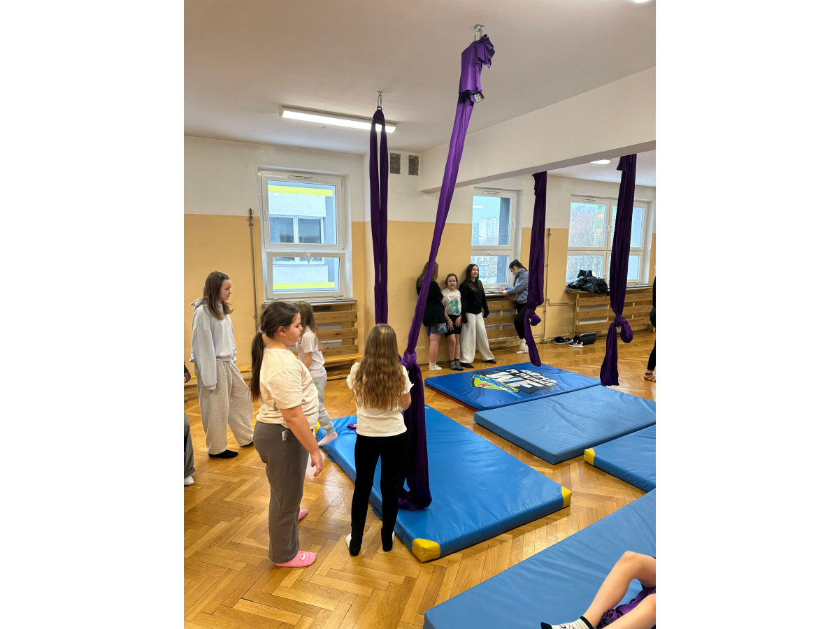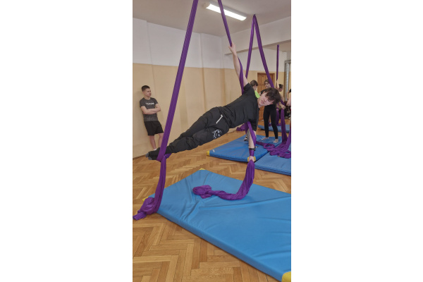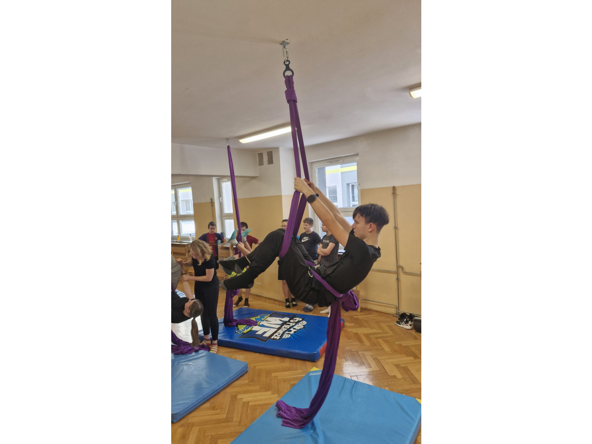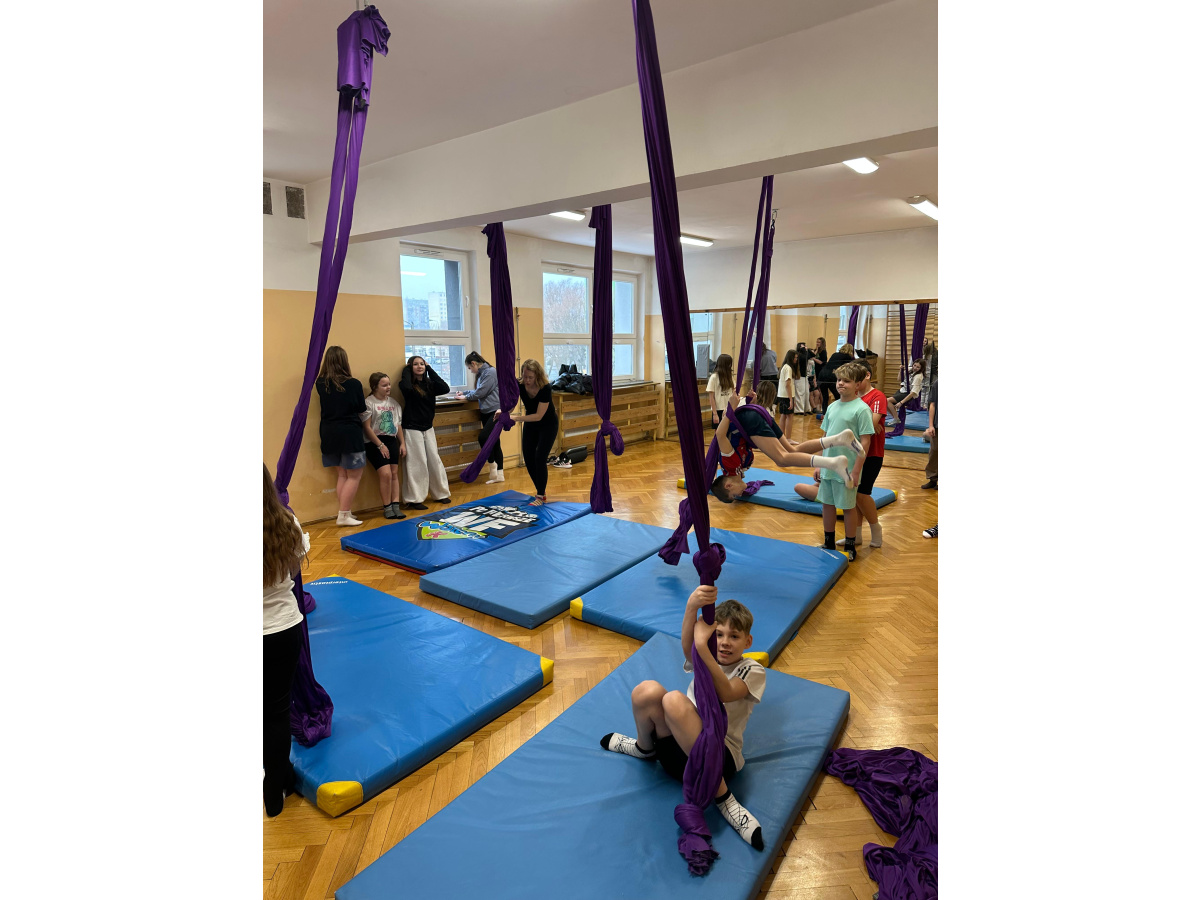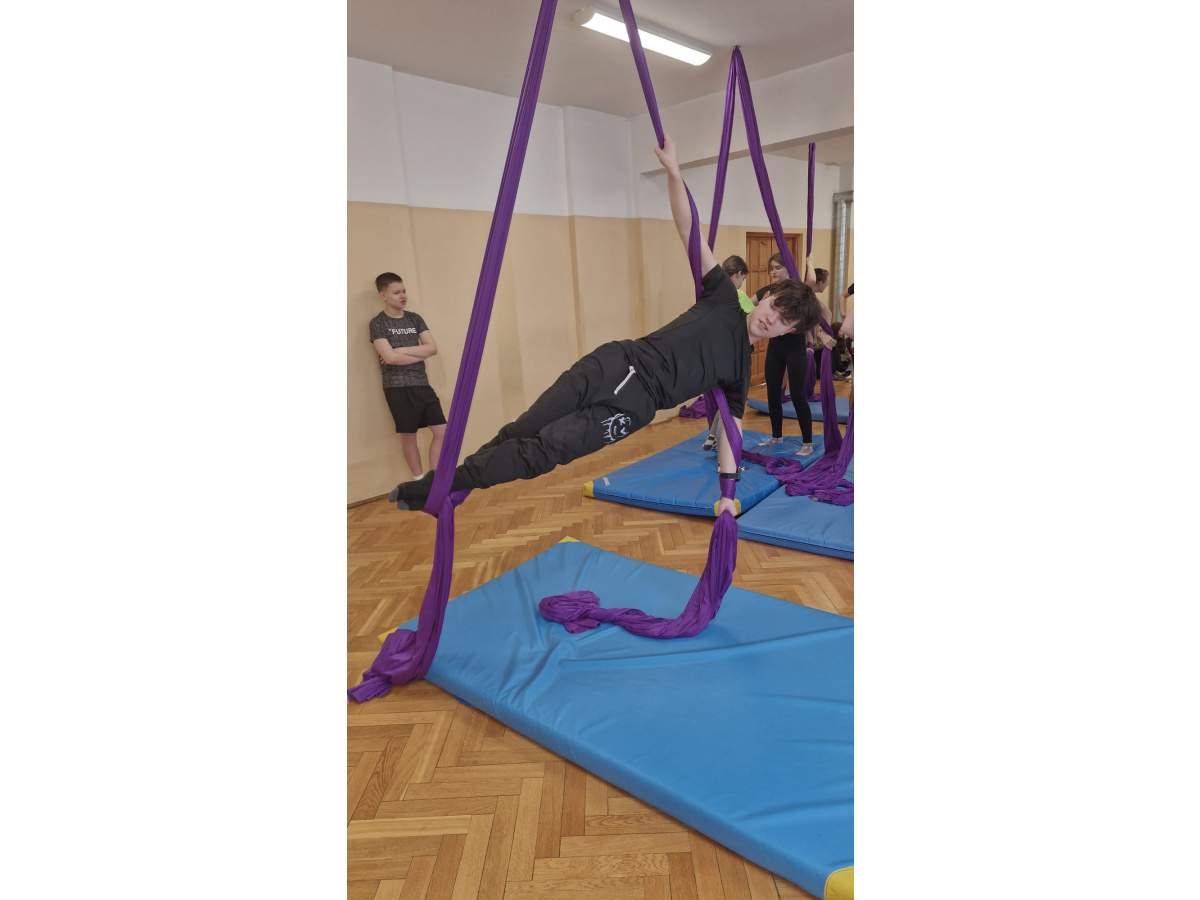 Uczniowie zgodnie przyznali, że była to jedna z najciekawszych lekcji wychowania fizycznego, w jakiej brali udział. Zwisające szarfy okazały się nie tylko atrakcyjnym narzędziem, ale także skutecznym sposobem na rozwijanie siły, koordynacji i kreatywności ruchowej. Tego typu zajęcia pokazują, że wychowanie fizyczne nie musi ograniczać się do schematycznych ćwiczeń. Odrobina innowacji i odwagi w doborze form ruchu potrafi zamienić zwykłą lekcję w niezapomniane doświadczenie, które na długo pozostaje w pamięci uczniów. Być może zdobyte doświadczenia zmotywuje chętnych uczniów do dalszego treningu. Więcej informacji dotyczącej zapisów na płatne, regularne zajęcia, które będą realizowane m.in. w naszej szkole (w poniedziałki i piątki od 26.01.2026) przez instytucję zewnętrzną Nope Studio.