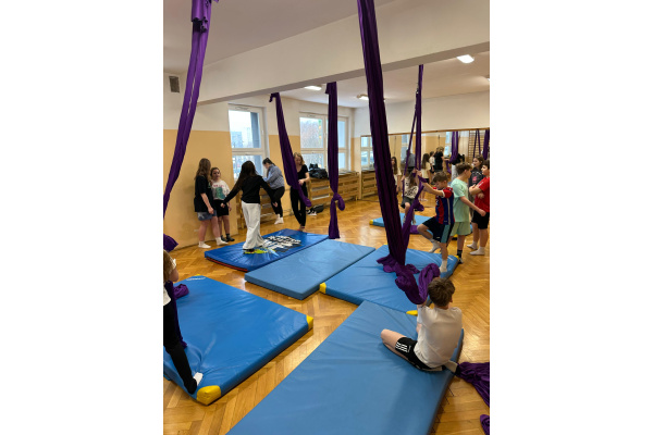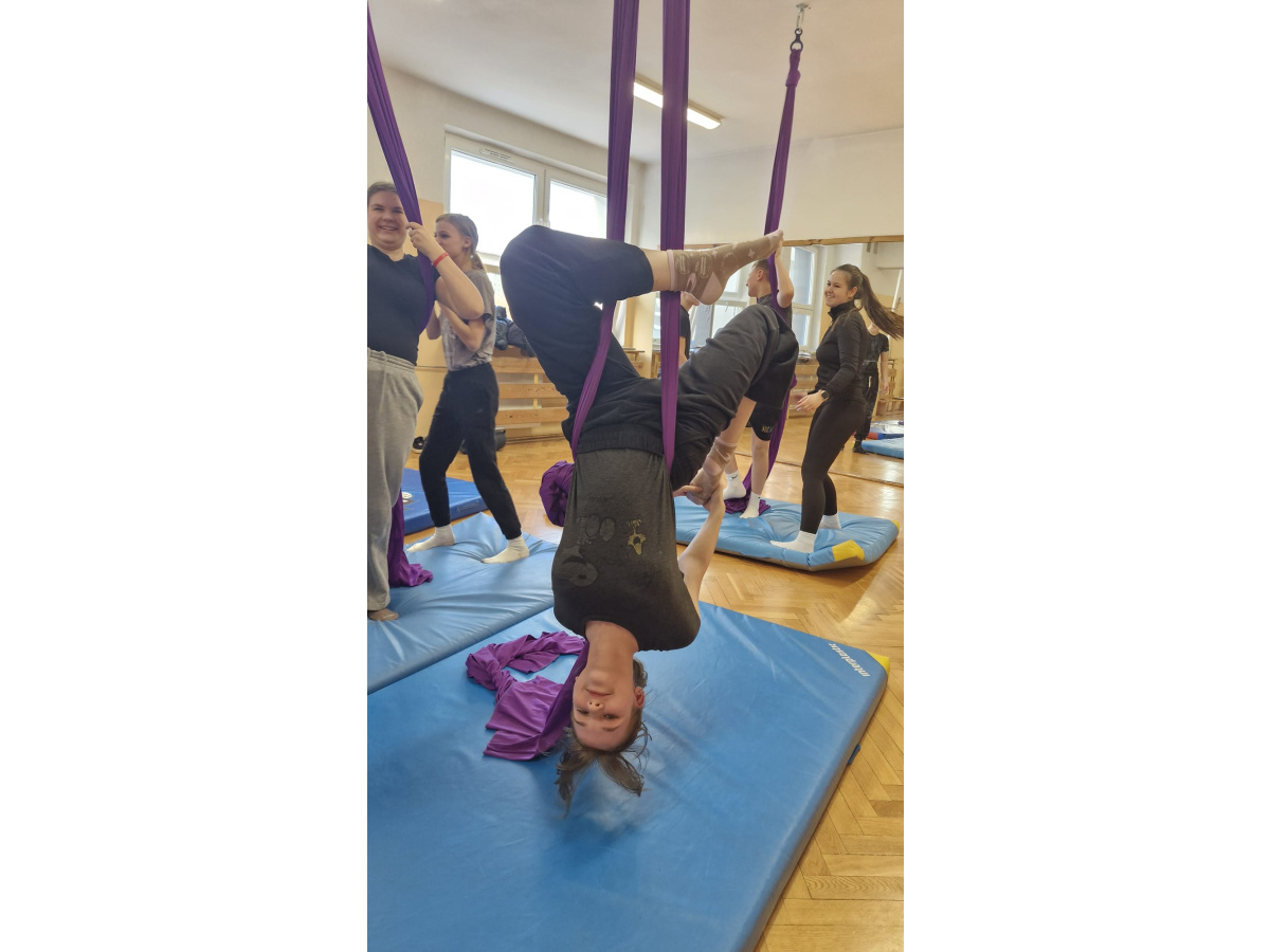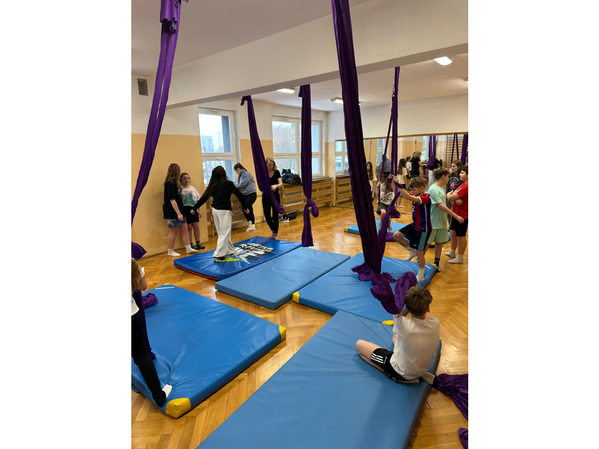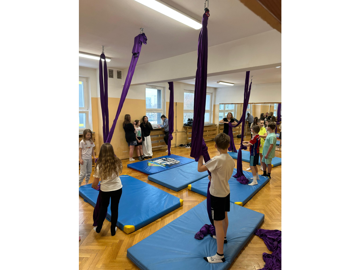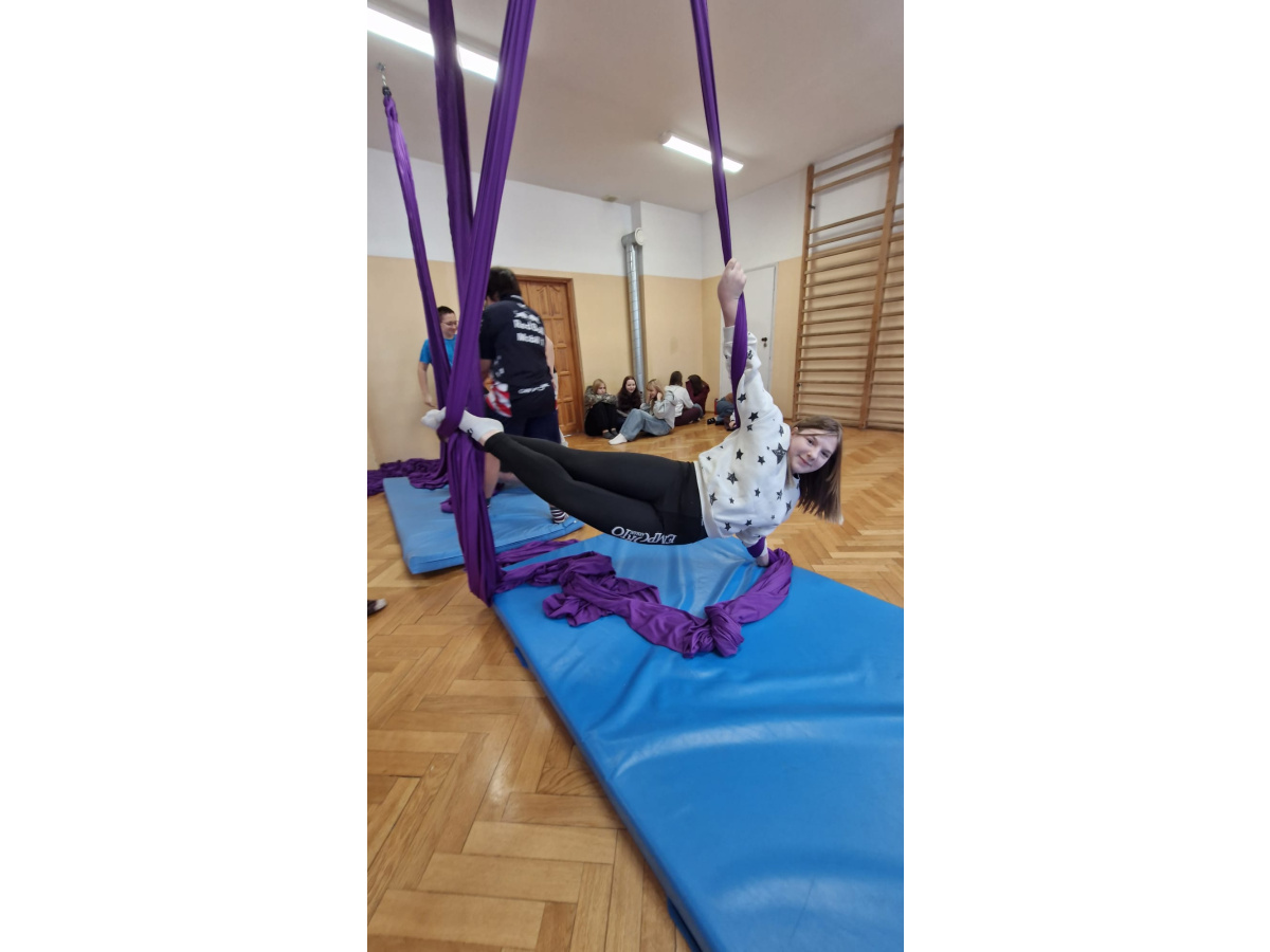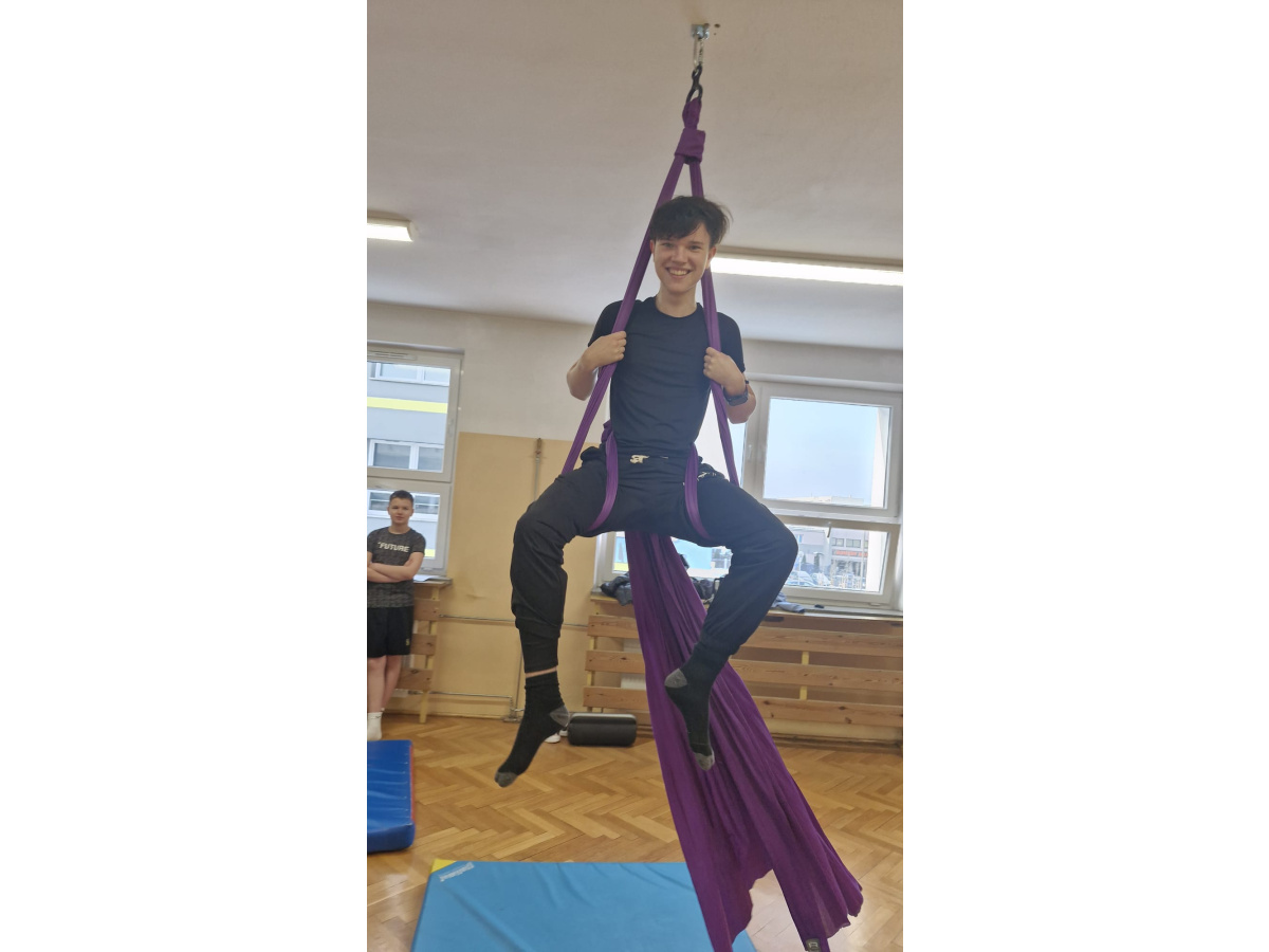 Uczniowie zgodnie przyznali, że była to jedna z najciekawszych lekcji wychowania fizycznego, w jakiej brali udział. Zwisające szarfy okazały się nie tylko atrakcyjnym narzędziem, ale także skutecznym sposobem na rozwijanie siły, koordynacji i kreatywności ruchowej. Tego typu zajęcia pokazują, że wychowanie fizyczne nie musi ograniczać się do schematycznych ćwiczeń. Odrobina innowacji i odwagi w doborze form ruchu potrafi zamienić zwykłą lekcję w niezapomniane doświadczenie, które na długo pozostaje w pamięci uczniów. Być może zdobyte doświadczenia zmotywuje chętnych uczniów do dalszego treningu. Więcej informacji dotyczącej zapisów na płatne, regularne zajęcia, które będą realizowane m.in. w naszej szkole (w poniedziałki i piątki od 26.01.2026) przez instytucję zewnętrzną Nope Studio.