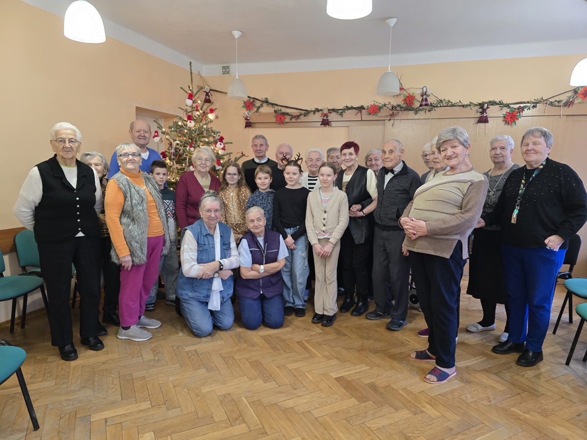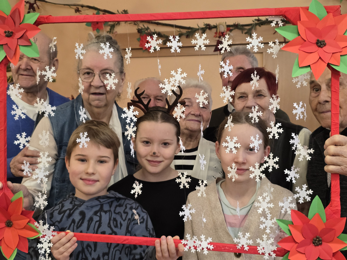 Delegacja naszej szkoły w czwartek (18.12.2025 r.) odwiedziła Dzienny Dom Pobytu dla Seniorów. Uczniowie wręczyli własnoręcznie wykonane upominki przygotowane przez klasę 3a. Podczas spotkania wspólnie kolędowano oraz wykonano pastorałkę "od serca do ucha". Występ został nagrodzony wielkimi brawami, a seniorzy okazali dużo ciepła i radości ze spotkania z młodym pokoleniem. Serdecznie dziękujemy organizatorom projektu "Aktywni Razem - wolni od uzależnień " za możliwość wspólnego przeżywania nadchodzących świąt.